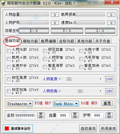 2、基础功能:可以在基础功能里面启动游戏,还有金钱、血量、护甲、任务高度、人物视角等一些基础工具。