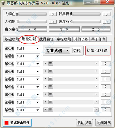 3、刷枪功能:最多可以设置9把枪的快捷键,武器分为专业武器、高级武器、暴徒武器三种类。初始化是F7键。