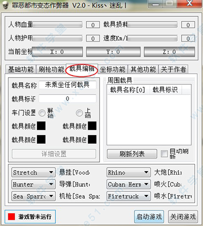4、载具编辑:可以对载具进行编辑,包括悬挂标记,安装导弹、机枪、大炮等工具,还可以显示周围的载具名称和标识。