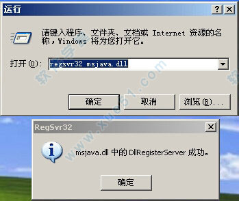4、最后点击开始菜单-->运行-->输入regsvr32 msjava.dll后,回车即可解决错误提示。