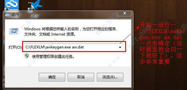 4、点击开始-->运行-->C:FLEXLMawkeygen.exe aw.dat (这步很重要 你复制进去 运行后 画面就闪一下就好了)
