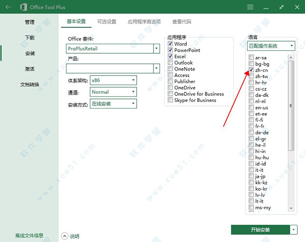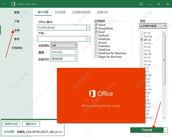 4、软件下载好后,我们点击安装office,右边是组件选择,你可以随意挑选你要下载的组件,设置下安装包架构(64位选x64,32位选x86),点击开始安装。