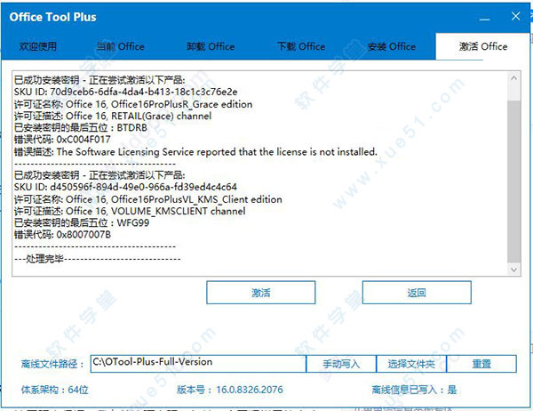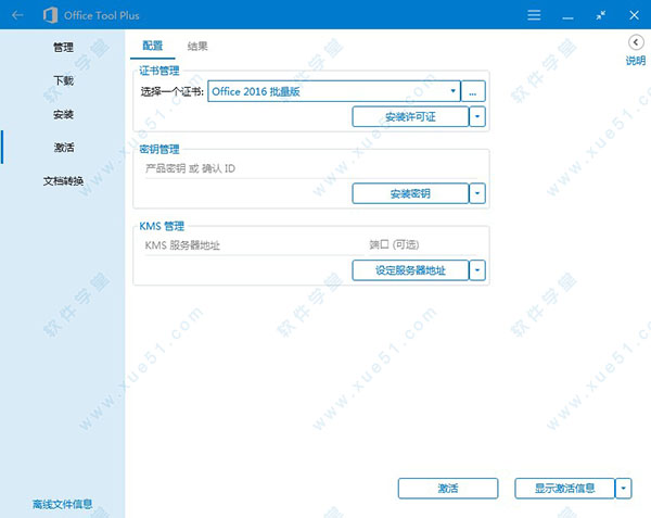 激活 。OTP 可以安装/卸载密钥、转换授权版本、配置 KMS 服务器地址、清除激活信息或者是证书、查询当前的激活信息。无论是联网激活、电话激活还是 KMS 激活, OTP 都可以轻松应付。(PS:OTP 不存在破解行为,只有配置 KMS 的功能)