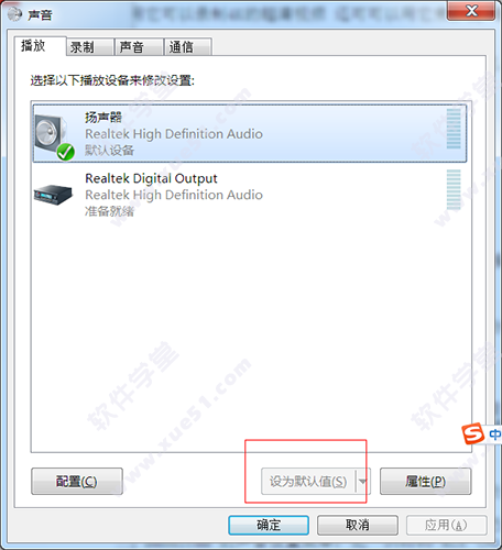 2) 在 Window 的 [播放] 声音设置菜单,选择“设置为默认值”。