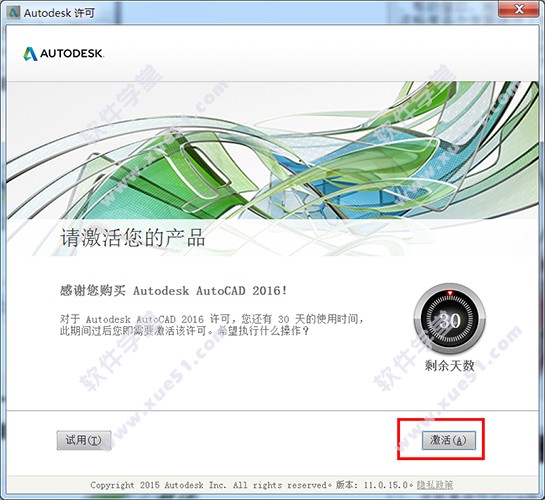 2、弹出Autodesk产品许可激活界面,我们可以看到软件试用期只有30天,点击“激活”开始激活软件