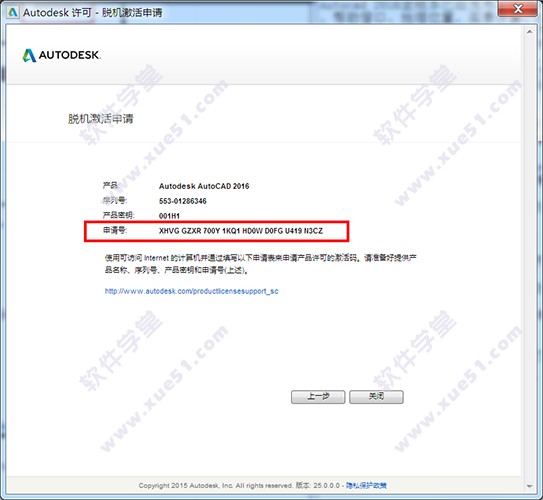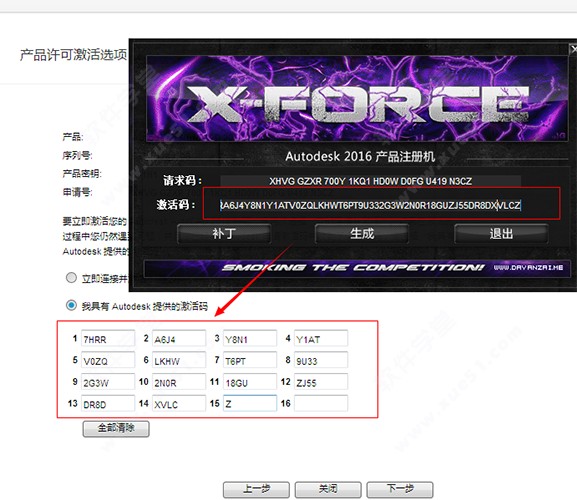 6、将生成好的autocad 2016激活码复制到如图框中,点击下一步即可