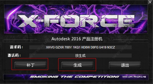 5、回到autocad 2016注册机数据包打开“Crack-xf-adsk2016_x64”或者“Crack-xf-adsk2016_x86”文件夹,用户可以根据电脑系统选择注册机,然后双击运行“xf-adsk2016_x64.exe”或者“xf-adsk2016_x86.exe”注册机,将刚才的申请码复制到请求码框中,点击“补丁“打入破解补丁,最后点击“生成”生成autocad 2016激活码