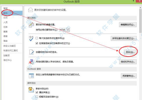 2、选择“邮件”---->再单击“签名”按钮。