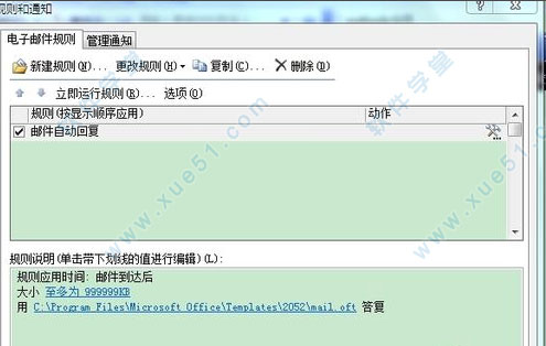 4、勾选“如何处理该邮件”项目中的“用特定模板答复”,然后单击“规则描述”项目中带下划线的部分“特定模板”(如图)在“选择答复模板”对话框中选中标准模板“mail”,并依次单击“打开→下一步→下一步”按钮。最后为该规则指定一个名称“邮件自动回复”并单击“完成→确定”按钮完成设置。