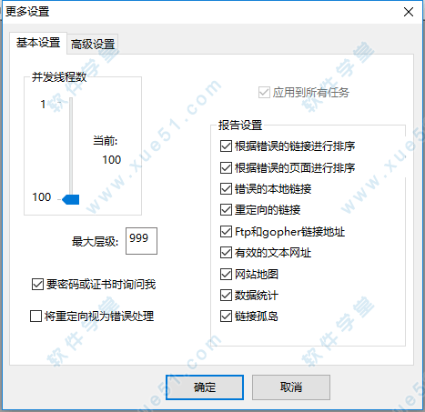 3、“设置菜单”可最多设置100个并列线程,最大测试层数貌似没有限制,但最大层次建议在6以内,否则会有很多链接,测试的速度和有效性会大打折扣,相信一般的网站链接也不会超过6层。报告(Report)可全选,一般比较关心的是中断链接、中断内部链接、统计、有效文字链接等