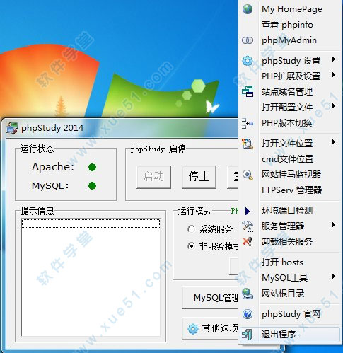 phpstudy2014是一个PHP调试环境的程序集成包,程序自带FTP服务器,支持多用户,无需再安装FTP服务器。自带网站挂马监视器,随时记录文件的修改情况,让挂马文件无处可逃。该程序不仅包括PHP调试环境,还包括了开发工具、开发手册等.总之学习PHP只需一个包,能够一次性一键安装好php网络调试环境,是站长们新建网站的好帮手。全面适合Win2000/XP/2003/win7 操作系统,支持IIS和Apache、Nginx、Lighttpd。同时自带FTP服务器,支持多用户,无需再安装FTP服务器。自带网站挂马监视器,随时记录文件的修改情况,最大程度保证用户的文件安全。该软件最大的一个亮点就是php扩展,以前修改配置文件都要跑到安装目录里面一个一个的找,但是现在用户使用软件即可以直接在菜单里直接修改,而且还可以一目了然的看到那些扩展已经使用,哪些未启用。本站提供