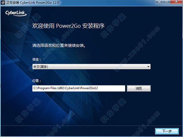 2、准备安装软件,双击Power2Go_12.0.0621.0_VL_Platinum_P2G180511-01_Normal.exe程序进行软件原版安装,安装语言选择中文(简体),软件安装位置点击“浏览”更改,也可默认安装位置,默认安装位置为C:\Program Files (x86)\CyberLink\Power2Go12
