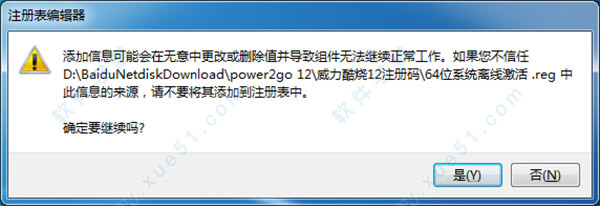1、接下来对软件进行破解,回到软件安装包打开威力酷烧12破解文件,双击运行“系统离线激活 .reg”导入离线激活的注册表,注意区分32、64位操作系统,点击“是”即可