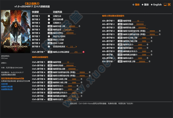 龙之信条2修改器风灵月影版是一款超级好用的游戏修改器工具,它支持版本更新使用。包含了清空损伤槽、编辑异界石、编辑负重上限、编辑点击物品数量等好用的修改功能。同时,它还支持编辑玩家基础属性,例如玩家等级、玩家经验值、职业点数、攻击力和防御力等等。