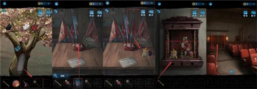 6、拿到箱子里的小人偶,将其放在第二间的壁龛上,获取木架子上物品的摆放顺序,拿到第一个玩具;然后点击小戏台,获得大堂树上蝴蝶的高低顺序。