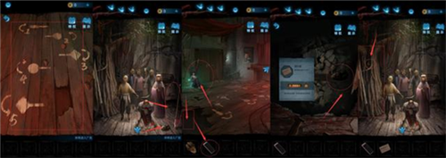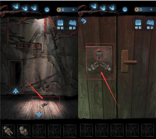 5、点击门板,用朱砂笔将门上的图案一笔连成;进入第三间,点击小木桌,拿到小木棍并获取鼓锣顺序;先将封条放在木箱上,然后点击红布将其拉下;按顺序敲锣打鼓,开启木箱。