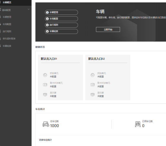 车辆部分包含车辆概览、基础配置、车辆管理、车辆检索等。可配置车辆、停车场、放行规则配置,提供实时车位统计及车辆进出记录应用。