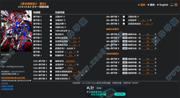 真女神转生5复仇修改器是一款功能强大的游戏修改器,支持玩家编辑仲魔属性、编辑玩家属性,包含了力、体、魔、速、运等属性,同时允许玩家修改游戏为无限HP、无限MP、无限行动、调整伤害和金钱等数据,一共包含了三十一项修改功能,让玩家可以非常轻松地完成游戏中的各种挑战。