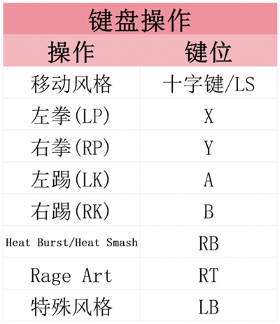 攻击按键对应角色的四肢:X(左拳);Y(右拳);A(左踢);B(右踢)。