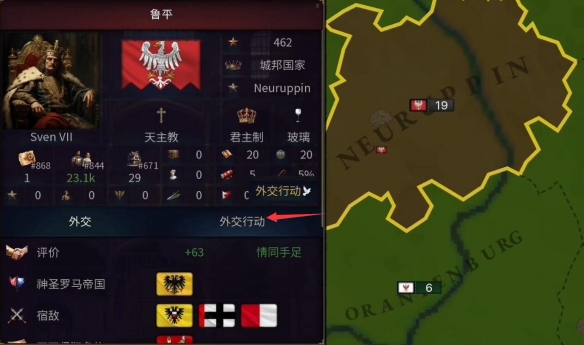3、如果想殖民有人的地方的话需要宣战,点【外交关系】-【外交侮辱】将关系降到-30才能宣战;