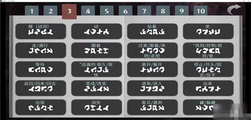3、做、动、站着、坐、走/通行、跟着、过来/跟着/来、找到/控制/抓、等待、迅速的 很久/很、离开/躲开、停止/尽头/固定/住手、返回/回来/回去、变成/改变、进来/进入、出来、出现、消失、看见/遇到、藏/躲藏