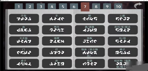 7、手指、手、脚、心脏、血、地方、路/道路、房间/家/据点、天花板、墙壁、地板、坑/洞、门、灯、物体、椅子、桌子、床、容器、线状物