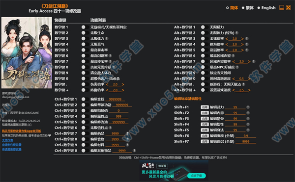 刀剑江湖路四十一项修改器为玩家提供了爽快的动作游戏体验,无限生命让你可以无限刷怪不用害怕血条清空而亡,伤害倍率自由调整让你能打出超高的大数字伤害,最高NPC好感度让你可以快速刷取人物好感,而无敌模式更是让玩家能成为最强不死。玩家可以按照个人的喜好来选择使用功能,快速完成游戏的修改。