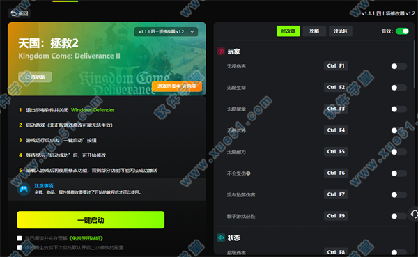 天国拯救2修改器是一款由风灵月影为《天国:拯救2》制作的游戏辅助工具,为玩家提供了四十项强大的修改功能,包含了无视伤害、无限生命、无限营养、超级伤害、骰子游戏必胜等,玩家还可以通过使用这款修改器来编辑自己的基础力量、敏捷属性,以及马术、炼金等技能,总的来说这款修改器功能是相当丰富的。