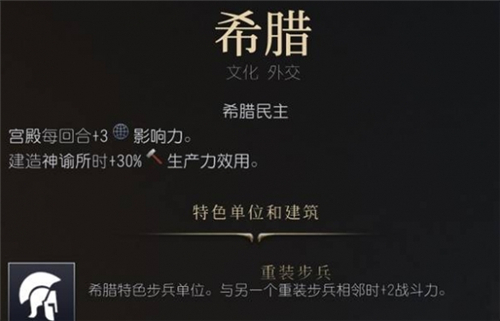 希腊特色步兵单位,与另一个重装步兵相邻时+2战斗力。