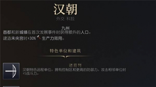 汉朝特色远程单位,拥有控制区和更高的防御力,攻击相邻单位时+5战斗力。