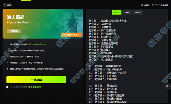 浪人崛起修改器是一款针对《浪人崛起》游戏设计的修改工具,玩家能够通过它来调整角色的各种数值,例如技能点数、材料数量、金钱、银币,还可以使用一些快捷键来一键开启无敌模式、无限生命、无限精力、隐身模式,甚至还能让你的同伴也能无限生命,陪你一起冒险。浪人崛起修改器的具体功能和使用方式可以参考下文,感兴趣的朋友欢迎在软件学堂下载使用。