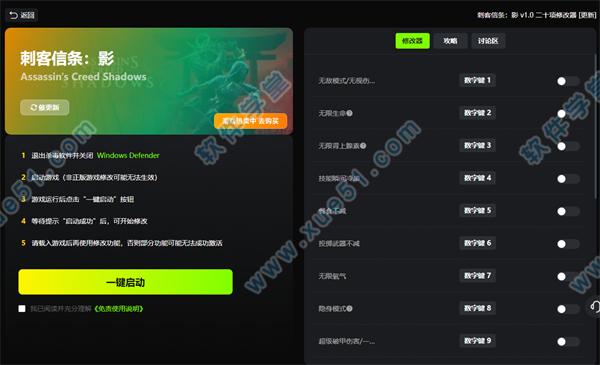 刺客信条影修改器风灵月影版是一款针对刺客信条:影游戏设计的修改器工具,它为玩家们带来了二十项实用的修改功能,例如无敌模式、无限肾上腺素、无限生命、隐身模式、无限氧气、无限特长点数、技能瞬间冷却、瞬移到标记位置等,让你能够在游戏中更加游刃有余。这款刺客信条影修改器界面简洁,操作简单好用,并且小编已经把具体的修改功能和对应的按键整理在下文了,感兴趣的朋友欢迎前来本站下载使用!
