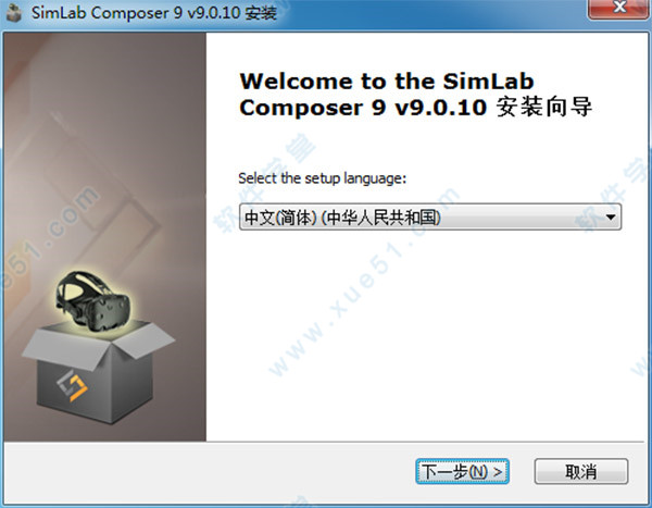 2、双击“SimLab_Composer_9_v9.0.1.exe”主程序运行,在安装向导界面选择【简体中文】,点击“下一步”。
