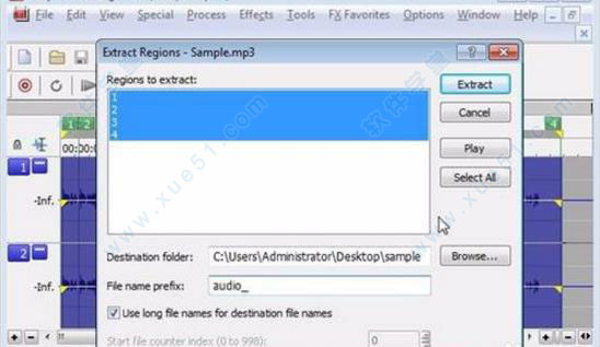 8、在弹出的对话框中选择所有 Region,将指定目标文件存放位置,将可以为目标文件指定一个前缀,比如 “Audio_”,点击 Extract 按钮