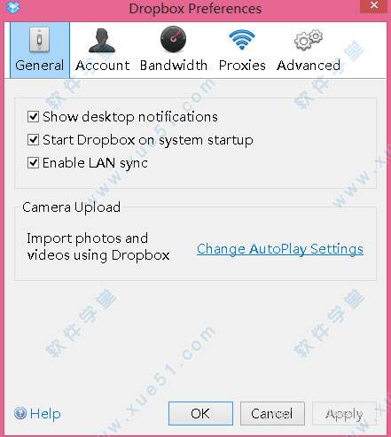 2、接下来,就会看到软件弹出一个设置窗口。分别为General(常规设置),Account(帐户设置),Bandwidth(带宽设置),Proxies(代理设置),Advanced(高级设置)。