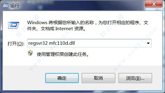 4、点击开始菜单-运行-输入内容“regsvr32 mfc110d.dll”后,回车之后就可以解决了