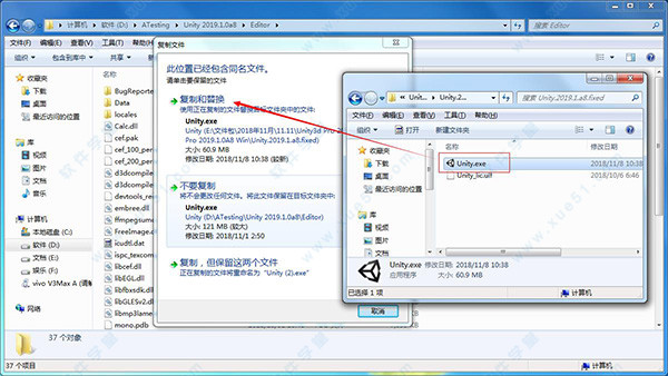 2、接着将同文件夹中的“Unity.exe”破解补丁复制到软件安装目录下替换源文件,默认路径为:【C:Program FilesUnity 2019.1.0a8Editor】。