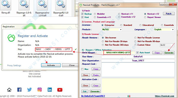 2、点击“generate”获取navicat for mysql 12注册码,到安装目录下运行navicat.exe将生成的注册码复制到软件注册页面上并点击“activate”激活