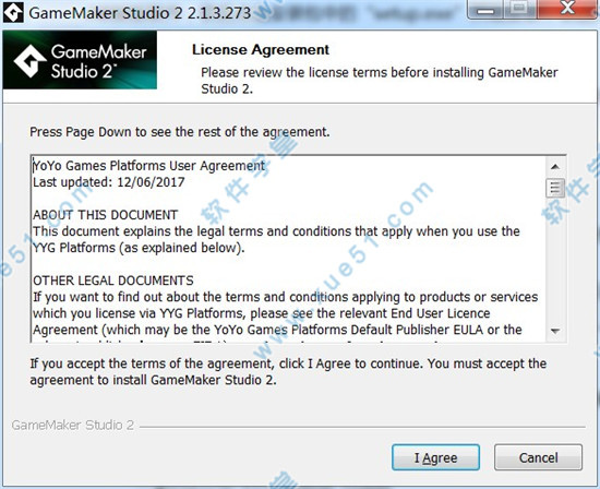 1、到本站下载gamemaker studio 2破解版软件,软后点击安装包中的“setup.exe”开始安装,会进入安装界面,我们点击下一步按钮i agree