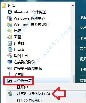 1、开始--所有程序--附件--右键“命令提示符”(cmd)--以管理员身份运行。