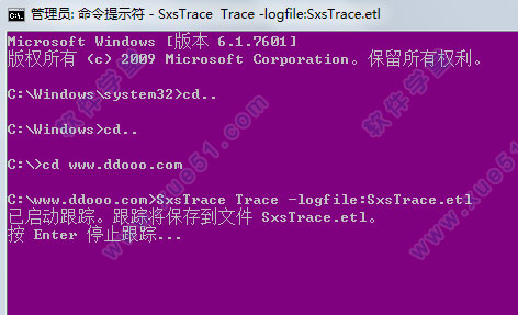 2、在命令行输入:SxsTrace Trace -logfile:SxsTrace.etl,启动跟踪。