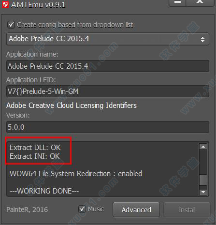 连接好网络,回到软件的安装包目录,打开里面的“amtemu.v0.9.1-painter.exe”破解补丁,选择“Adobe Prelude CC 2015.4”,点击:“Install”。