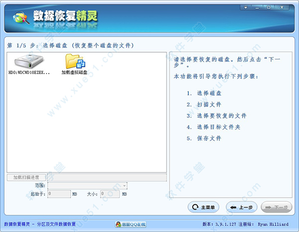 2、当虚拟磁盘被加载后,您就可以在“选择磁盘”及“选择分区”界面中看到它了。可以像对待普通磁盘一样恢复其上的分区及文件了。操作步骤完全相同。