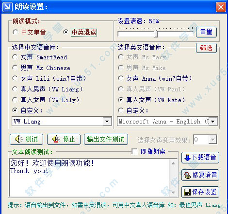 英文语音库和真人语音库都要从网上下载。当朗读出现异常,可点击“修复”来解决。并可“保存”之。