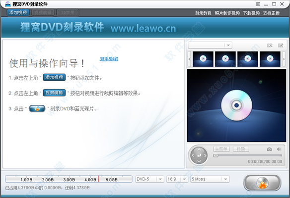 4、狸窝dvd刻录软件支持制作ISO、PAL/NTSC 比例16:9和4:3、显示输出体积, 支持D5(4.7G)、D9(8.5G).