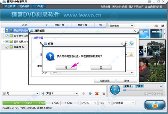 8、支持光盘擦除功能,我插入的光盘是上次刻录过的,所以狸窝dvd刻录软件会检测提示插入的不是空白光盘,现在要擦除数据重新刻录吗?单击是,软件就会进行光盘擦除工作。当擦除完成后自动进入光盘刻录流程。刻录过程中有一个“跳过”意思是此视频符合刻录要求,不再进行制作将直接进行刻录