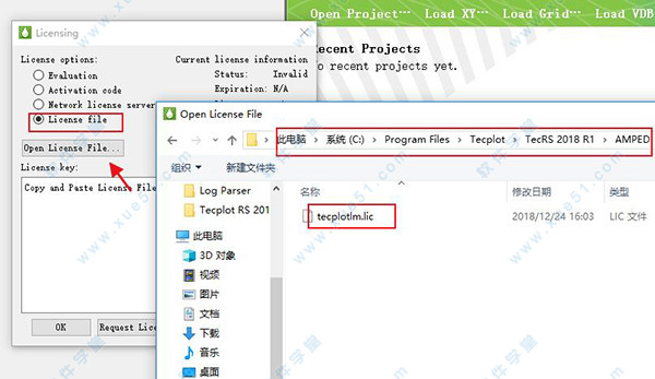 5、打开电脑桌面上的软件,弹出授权,选择license file,点击open license file--选择【C:\Program Files\Tecplot\TecRS 2018 R1\AMPED】目录下的tecplotlm.lic文件--ok。