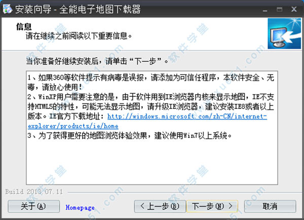 2、WinXP用户需要注意的是,由于软件用到IE浏览器内核来显示地图,IE不支持HTML5的特性,可能无法显示地图,请升级IE浏览器,建议安装IE8或者以上版本。