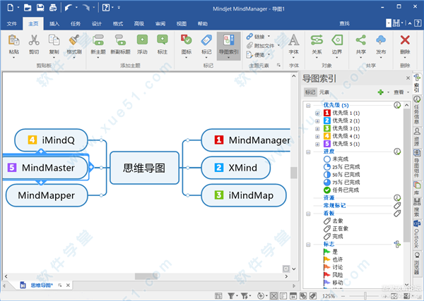 MindManager 2019是一款在其旧版本软件上进行了全面升级和优化的创造、管理和交流思想的通用标准的绘图软件,它新增加了优先级视图,可以在整洁的界面中将您的优先级隔离,使下一步骤变得清晰,同时也新增加了计划视图,让用户可以更有效地规划和使用您的时间,只需拖拉鼠标即可对您创建的行动事项进行安排以及添加日期。Mindjet MindManager 2019可以制作学习计划和进度、展示各种信息等,从而让复杂的事情简单化,形象化,让你快速理清思路,抓住重点;拖动主题,在不同的想法之间绘制连接,并将相关的注释,链接和文件存放在它们所属的位置 - 它们都包含在一个清晰,易于导航的地图中。该软件主要由中心主题、主题、子主题、附注主题、浮动主题、关系线等模块构成,最重要的是该软件使用起来也是非常简单,不需要专业知识,就算是新手都可以很快就上手。