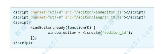 2、在该HTML页面添加以下脚本,第一个参数可用其它CSS选择器,匹配多个textarea时只在第一个元素上加载编辑器。通过K.create函数的第二个参数,可以对编辑器进行配置,具体参数请参考 编辑器初始化参数 (官网有详细介绍)。